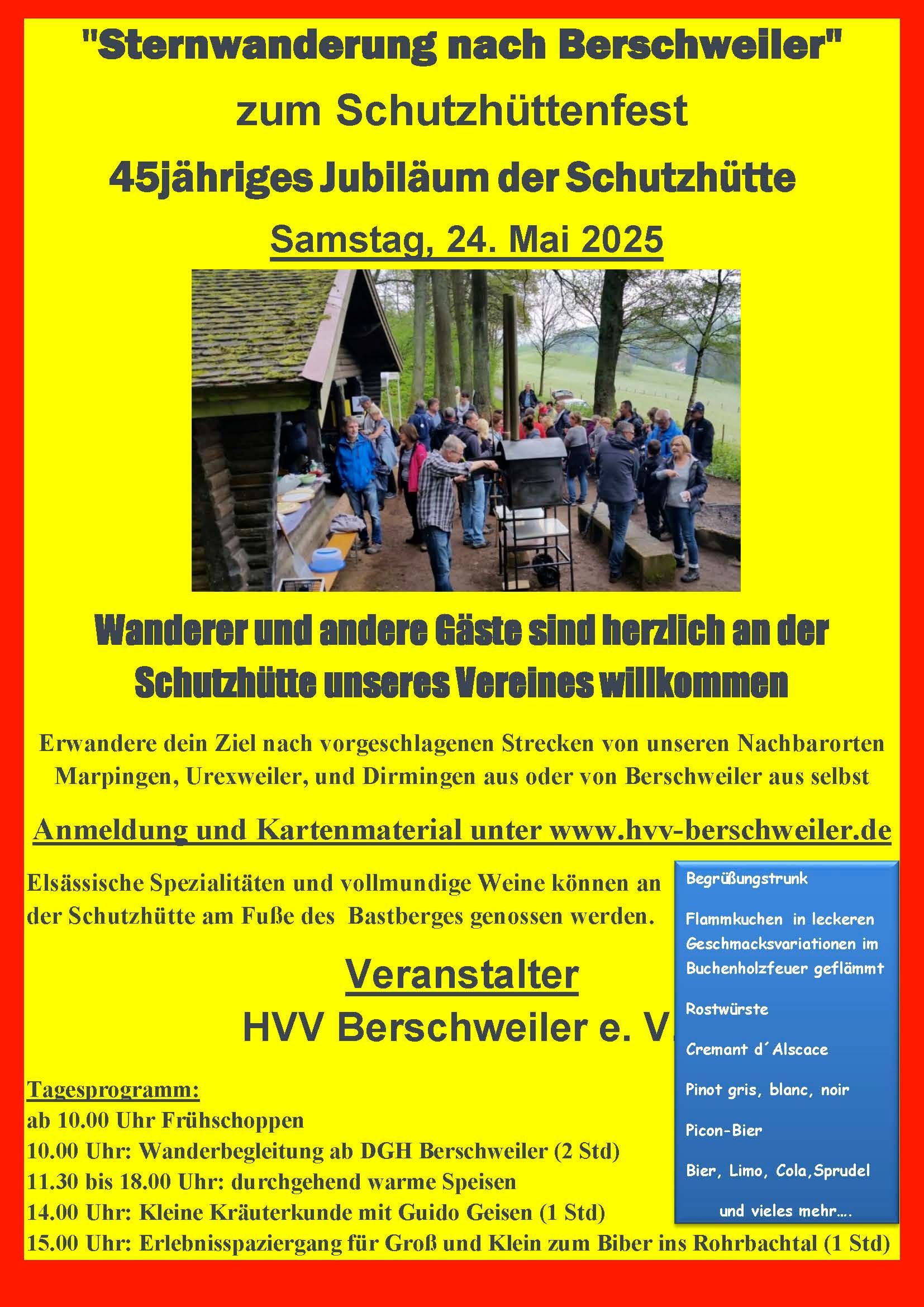 Der Heimat- und Verkehrsverein Verschweiler e. V. lädt für Samstag, den 24.05.2025 zu einer Sternwanderung an die vereinseigene Schutzhütte am Berschweiler Bastberg ein.